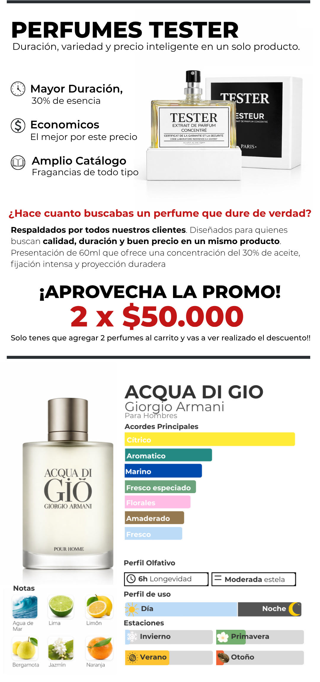 Acqua di Giò es una de las fragancias más icónicas y emblemáticas de Giorgio Armani. Se ha convertido en una de las fragancias masculinas más populares y apreciadas, y sigue siendo un referente en el mundo de la perfumería. Esta inspirado en las costas del mar Mediterráneo y la naturaleza de las Islas Eolias, en Sicilia. La fragancia tiene como objetivo evocar la sensación de una brisa fresca del mar, la ligereza del aire y la pureza de las aguas cristalinas. Acqua di Giò transmite la sensación de estar cerca del océano, con un enfoque en lo natural y lo fresco, y se aleja de fragancias más pesadas y complejas, celebrando la frescura y la claridad.